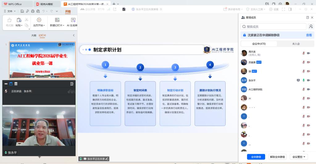 为深入贯彻教育部2026届高校毕业生“春季促就业攻坚行动”精神,帮助毕业生认清就业形势、明确求职方向、提升就业竞争力,4月8日晚,AI工程师学院通过腾讯会议平台举办了“2026届毕业生就业第一课”专题活动。活动由学院办公室主任周杰龙主持。学院院长张永平、副院长胡垂立、学工办主任钟伟出席会议。张永平院长作专题报告与讲话,全体2026届毕业生在线参加。