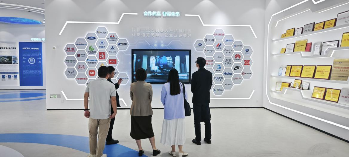 调研伊始,在企业负责人雷总、李总的陪同下,胡垂立副院长一行首先参观了华数机器人企业展厅。展厅内,企业工作人员详细介绍了华数机器人的发展历程、核心技术优势及产业布局——作为国产工业机器人领军企业,华数机器人佛山园区是集产品研发、制造和服务于一体的重要基地,年产量超2万台,在机器人控制器、伺服驱动等核心部件上实现自主可控,核心自主创新占比超90%。同时,工作人员还展示了企业全系列机器人产品,包括工业机器人、协作机器人等六大系列40多种规格,介绍了产品在3C、汽车制造、家电等多个行业的应用场景,以及企业与国内外多家高校、企业开展产学研合作的丰硕成果,让调研团队对企业的综合实力和发展前景有了全面了解。