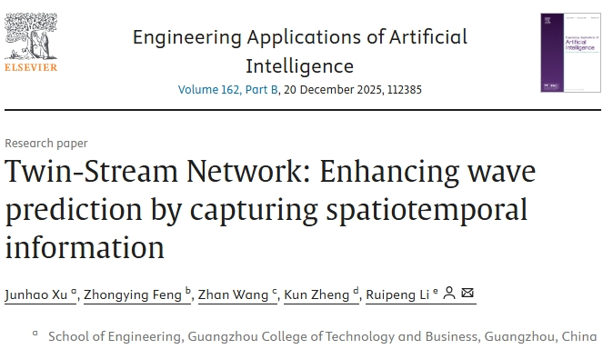 【本网讯】AI工程师学院徐俊豪老师在计算机科学与技术领域顶级期刊、国际自动控制联合会(IFAC)官方期刊《Engineering Applications of Artificial Intelligence‌》(IF=8.0)发表题为“Twin-Stream Network: Enhancing wave prediction by capturing spatiotemporal information”的学术论文.