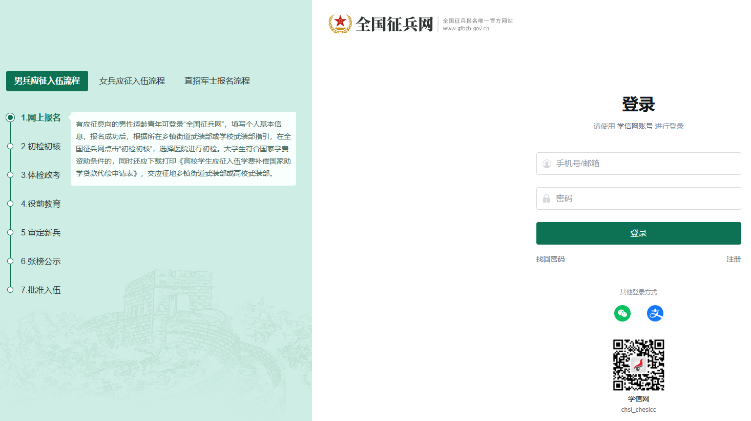 1.【https://www.gfbzb.gov.cn/】打开征兵网址,直接点击“兵役登记”进入对应页面;若入口显示不同,可从“应征报名(男兵)”通道进入。