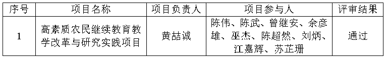 根据《广东省教育厅关于开展2022年省继续教育质量提升工程建设类项目验收工作的通知》要求,成人教育管理处于12月31日组织专家对我校2021年省继续教育质量提升工程项目(项目编号:JXJYGC2021KY0660)进行了结项验收评审,公示时间为:2025年12月31日--2026年1月7日。现将评审结果进行如下公示: