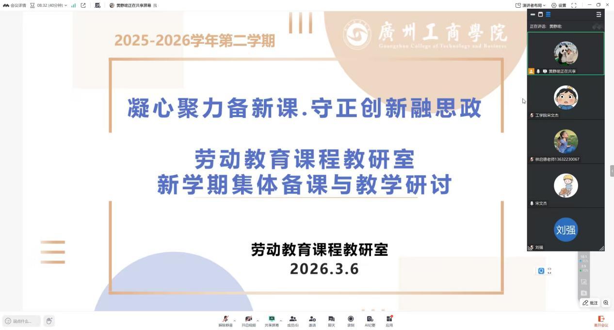 为深化立德树人根本任务,推进“五育并举”落地见效,2026年3月6日上午,劳动教育课程教研室召开新学期集中备课与教学研讨会。会议由教研室主任黄静瑜副教授主...