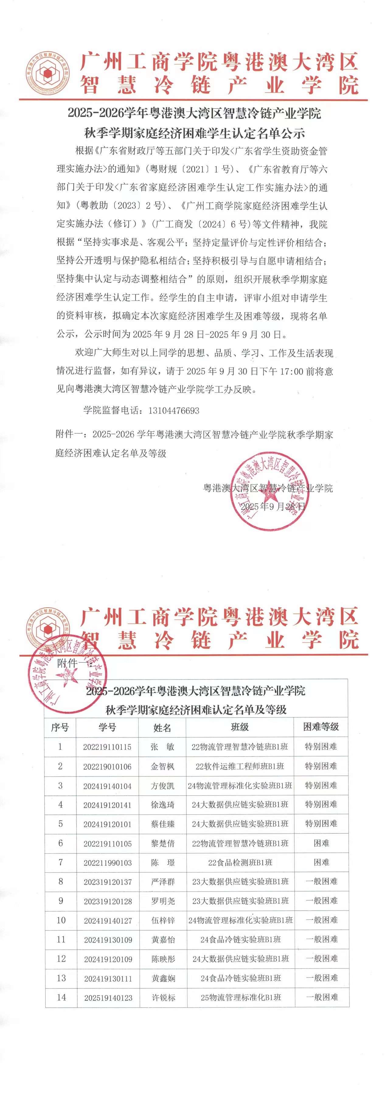 粤港澳大湾区智慧冷链产业学院2025-2026学年秋季学期家庭经济困难学生认定名单公示