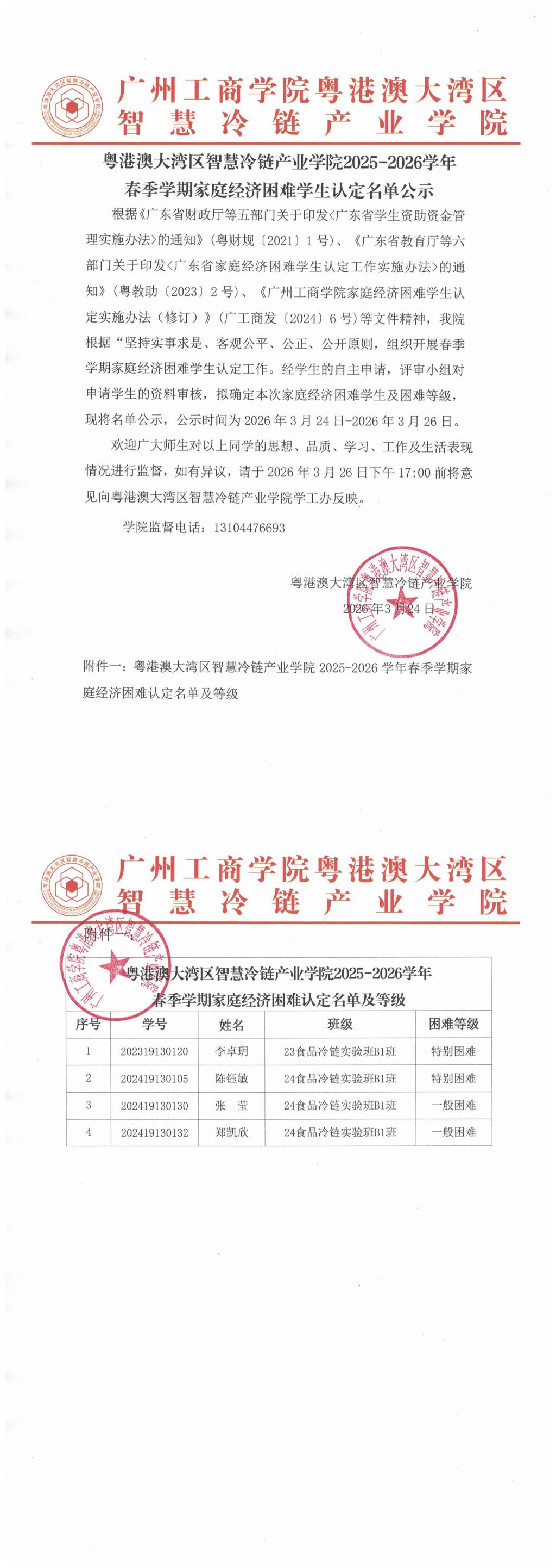 粤港澳大湾区智慧冷链产业学院2025-2026学年春季学期家庭经济困难学生认定名单公示