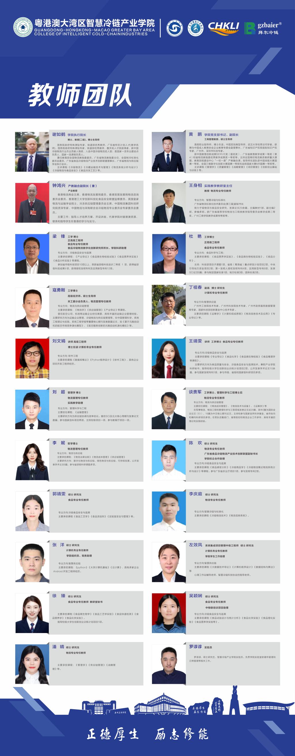 截止 2025年9月,产业学院现有教职工27人。其中,专任教师20人(一人为退休返聘),行政管理、学生管理及实验管理人员7人。教授3人,正高级工程师、副高级工程师5人,硕士及以上学历20人,其中博士9人。聘任国内冷链物流领域领军人才担任学院领导。突出产业人才培养,聘请产业资历丰富、技术力量雄厚的企业、研究院、商协会等骨干人员60多人作为产业教授、产业导师,其中博士3人,高级工程师8人,企业董事长11人,商协会会长2人。根据人才培养需要,产业学院在广州工商学院择优聘请相关专业教师、骨干教师作为兼课和兼职教师。
