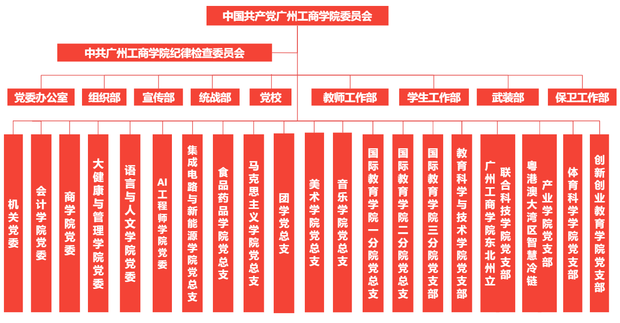 学校高度重视党的建设。2009年1月,学校经中共广东省委教育工委批准,正式成立党委,选举产生了第一届委员会,分别于2014年6月、2021年5月召开第二次和第三次党员代表大会选举产生了第二届和第三届党的委员会以及新一届纪律检查委员会。学校党建体系完善、机构齐全,设有党委办公室、组织部、宣传部、统战部、学工部、武装部、党校等职能部门,各学院、机关处室按规定标准设置党委、党总支或直属党支部,目前共有党委6个、党总支8个和直属党支部6个,全校党员共计1600余人。学校把党建工作列入整体发展规划,在人、财、物等方面给予大力支持。