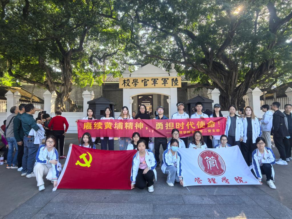 【本网讯】为深化党史学习教育,引导青年党员从百年党史中汲取奋进力量,筑牢使命担当,管理学院学生第二党支部于2025年12月18日组织全体党员前往广州黄埔军校旧址纪念馆,开展“赓续黄埔精神,勇担时代使命”主题参观学习党日活动,以实地研学的形式推动党性教育走深走实。作为中国近代革命史上的重要坐标,黄埔军校孕育的“爱国、革命、牺牲、团结、奉献”精神传统,跨越时空、历久弥新。活动中,党员们怀着崇敬之心,先后参...