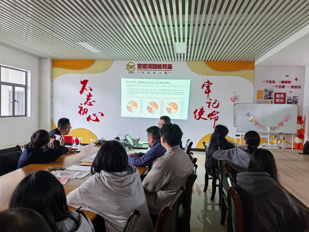 随后进行的第二环节,活动场地被转移至公司会议室。公司招聘主管为同学们带来了一场精彩的专题讲座。主管首先系统介绍了金银河公司的发展历程、核心业务、技术优势以及在新能源智能装备领域的战略布局与突出成就。结合全球能源转型趋势,主管深入浅出地分析了新能源产业链的发展现状与未来前景,帮助同学们把握时代脉搏,理解新兴产业动态。