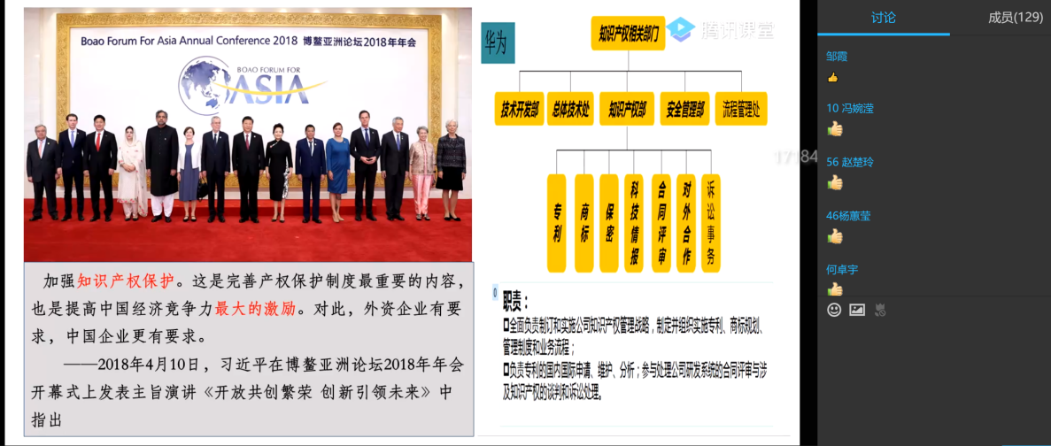 第二场公开课由刘雪萍老师讲授,在刘老师的《经济法》公开课中,她以竞争法为例,利用翻转课堂模式下的腾讯课堂讲授+学习通的多平台混合式教学方法,将华为公司的创新精神与国产替代、党与政府的知识产权保护政策、国人当自强、社会主义核心价值观等课程思政元素巧妙地融入专业知识点当中,还将网络热点事件如“美国高通公司为什么被中国政府处罚”事件做为互动议题,激发了学生的学习兴趣,将课程内容与思政教育实现了无缝对接。