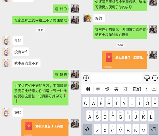 当前,新冠肺炎疫情还未结束,工商管理系根据学院文件要求,积极探索线上教学模式,切实做到“停课不停学”。在积极探索线上教学的过程中,系部全体师生一起克服种种苦难。其中,部分偏远地区的困难学生由于网络原因未能很好的进行网上学习这一情况尤为突出。为此,工商管理系党总支从实际情况出发,为确保不落下任何一个学生,特意为每一位困难学生送上“爱心流量包”,以便困难学生更好地进行线上学习。