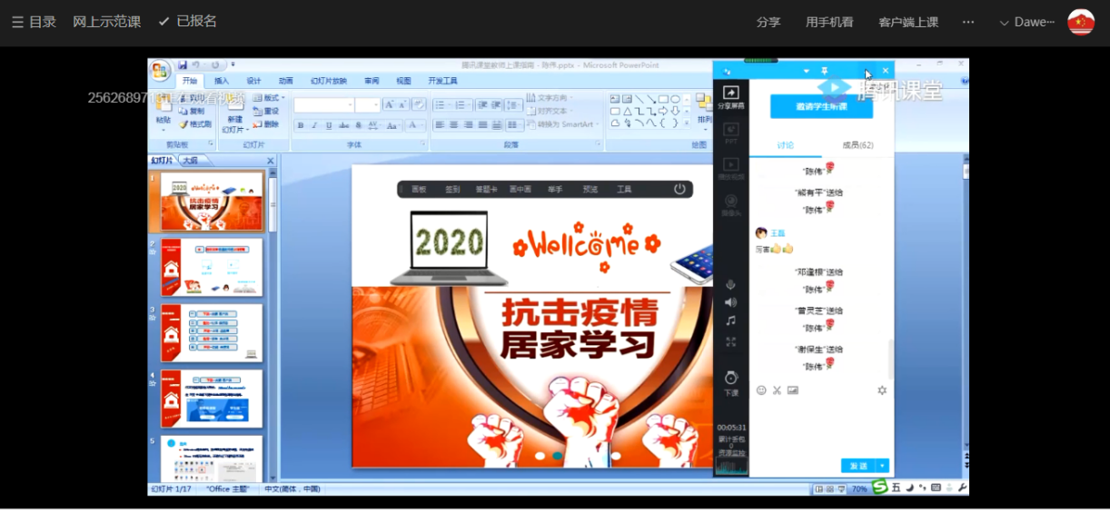 陈伟老师结合个人多年企业与学校教学经验,运用QQ分享屏幕功能和腾讯课堂客户端软件,仔细地给各位老师分享了如何利用现代网络工具进行网上教学课堂活动,从软件的下载安装、功能使用、课堂教学活动的开展和应用技巧等方面进行示范和讲解。通过软件远程示范了《管理信息系统》课程中的《数据与信息》章节知识点,网上课堂从观看新冠肺炎专题教育视频进入课程,课程巧妙融入思政元素,提出问题到分析问题再到解决问题,展现出本节的知识点数据与信息概念的区别与联系,信息与知识、知识与智慧的内在关联,激发掌握信息、学习知识、启迪智慧、增长才干的兴趣与动力。同时,在课程中示范了设置讨论互动知识点及问题等活动。