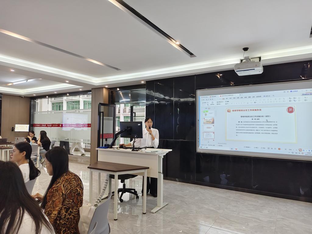 会上,学工办副主任蒙宗玲带领全体班主任深入学习《管理学院班主任工作实施办法》,逐章逐条解读细则要求,明确班主任在学生思想引导、学业帮扶、日常管理等方面的核心职责。同时,蒙老师详细介绍兼职班主任量化考核表的评分标准与考核维度,强调考核的激励与导向作用,鼓励班主任以高标准落实工作。此外,针对学生工作管理服务系统的填报流程、操作要点及注意事项,蒙老师进行现场演示与细致指导,助力班主任高效开展线上工作。