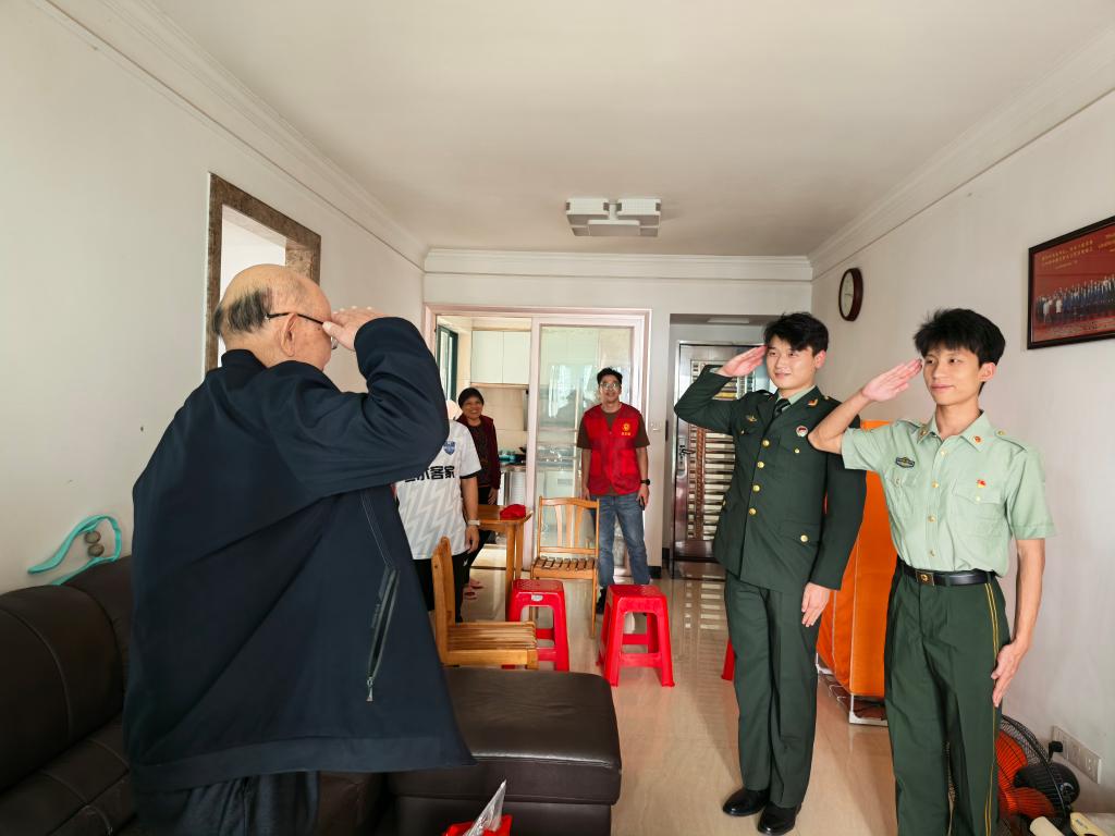 在走访慰问过程中,这些鲜活的抗战爱国故事以“老兵讲党课”形式,在四位老英雄的家中呈现出来,让支部党员深刻领悟到“四个意识”与“两个维护”的实践内涵,实现了“从历史中汲取智慧,在实践中传承精神”的闭环。最后,支部四名退役大学生党员以自己最高的礼仪向老英雄表达了最深的敬意。