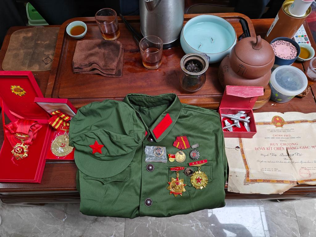 谢序光老人曾于1965年出国作战,参加了1965-1973年的抗美援越战争,此后一直在部队工作直至退休。他向支部党员展示了自己珍藏多年的65式军装,以及来自中国和越南政府颁发的军功章和奖状,那是他最英勇的时刻;军功章中还有两架在战火中用美军飞机残骸制作的小飞机模型,那是他和战友们对胜利的浪漫纪念;此外还有一枚“光荣在党50年”的勋章,那是谢老毕生无可替代的荣耀,连同他的一片赤诚之心熠熠生辉。