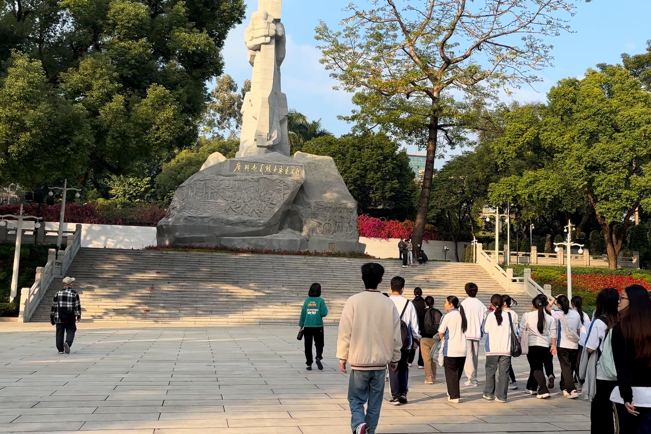 纪念馆内的泛黄书信、锈迹斑斑的枪械、珍贵的历史照片等文物史料,穿越时空至今熠熠生辉;园区内英勇烈士们的雕像身躯挺拔如松,胸膛微微挺起,仿佛仍在迎着风前行,生动再现了1927年12月11日那场震惊全国的武装起义。从张太雷、叶挺、叶剑英等革命先辈策划起义,到教导团与工人赤卫队并肩作战,再到起义失败后英烈们面对屠刀宁死不屈的壮举,一段段悲壮的历史让同学们热泪盈眶。