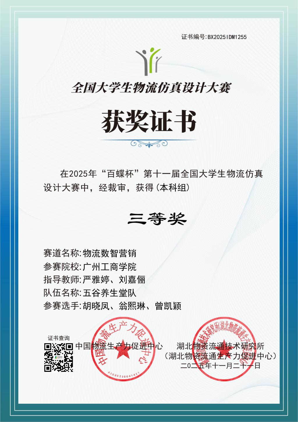 【本网讯】2025年11月20日,“百蝶杯”第十一届全国大学生物流仿真设计大赛总决赛圆满落幕,广州工商学院管理学院的两支参赛队伍凭借出色的表现,双双荣获三等奖,为学院争得了荣誉。