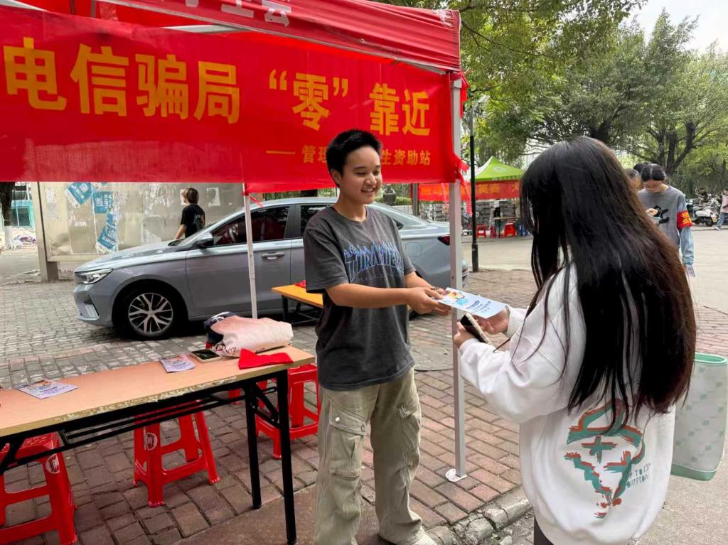 活动当天,陈姊祎老师带领志愿者们化身宣传使者,手持精心印制的反诈、控烟宣传单页,热情地向往来师生递出宣传资料。面对围拢过来的同学,志愿者们化身“安全宣传员”,细致讲解电信诈骗的常见套路,从刷单返利、冒充客服退款,到游戏账号交易、校园贷陷阱,结合发生在校园周边的真实案例,拆解骗子环环相扣的诈骗手段。他们反复强调“不轻信、不透露、不转账”的反诈口诀,提醒大家保管好个人信息,遇到可疑情况及时向老师和警方求助。