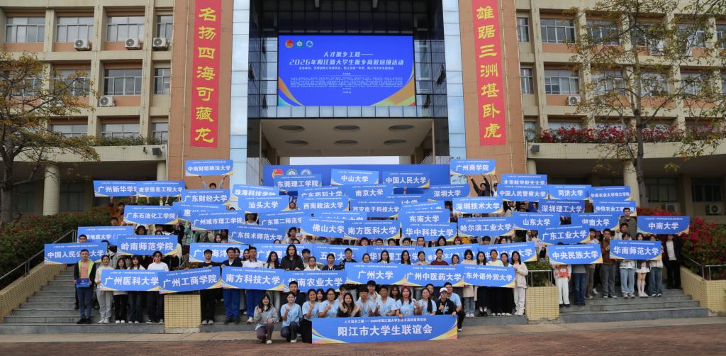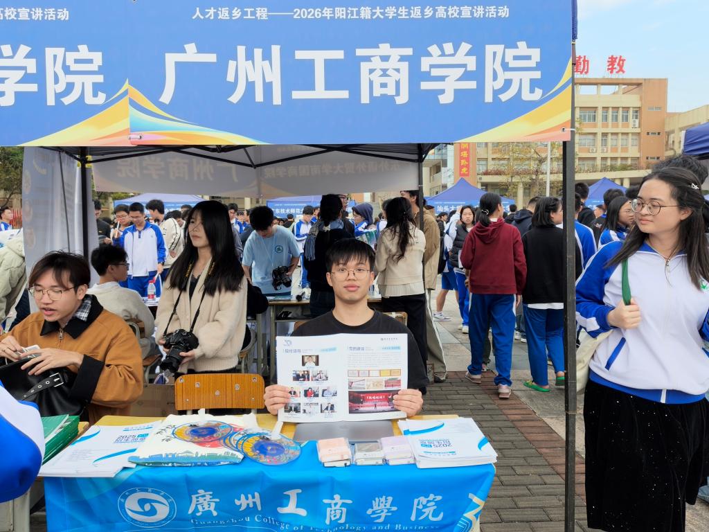 【本网讯】2026年2月8日,由共青团阳江市委员会、阳江市第一中学、阳江市大学生联谊会联合主办的“人才返乡工程——2026年阳江籍大学生返乡高校宣讲活动”在阳江市第一中学顺利开展。广东省内外62所高校的阳江籍学子回到高中学校摆摊宣讲,为高三学生了解高校和专业选择搭建平台。广州工商学院管理学院学子李绍弘团队积极参与其中,以实际行动践行学校“德学·五进”教育理念,展现了广工商学子“五进”实践中的责任担当。