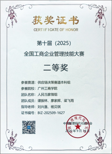 【本网讯】近日,第十届(2025)全国工商企业管理技能大赛圆满落幕,广州工商学院管理学院2024级周升宏、黄浩家、陈伟浩三名同学组成的“还能蒸”团队,在管理学院大数据管理与应用专业刘兴垦博士、陆晓琴老师的精心指导下,从全国高校本科队伍中脱颖而出,荣获数智沙盘赛道本科组全国一等奖(证书编号:BIZ-202509-1629);另外,2024级谭振林、廖家辉、梁飞雨三名同学组成的“人民当家做组”团队,在刘兴垦博士、杨贝奇老师的联合指导下,从全国高校本科队伍中脱颖而出,荣获供应链决策赛道本科组全国二等奖(证书编号:BIZ-202509-1627)为学院再添成果。