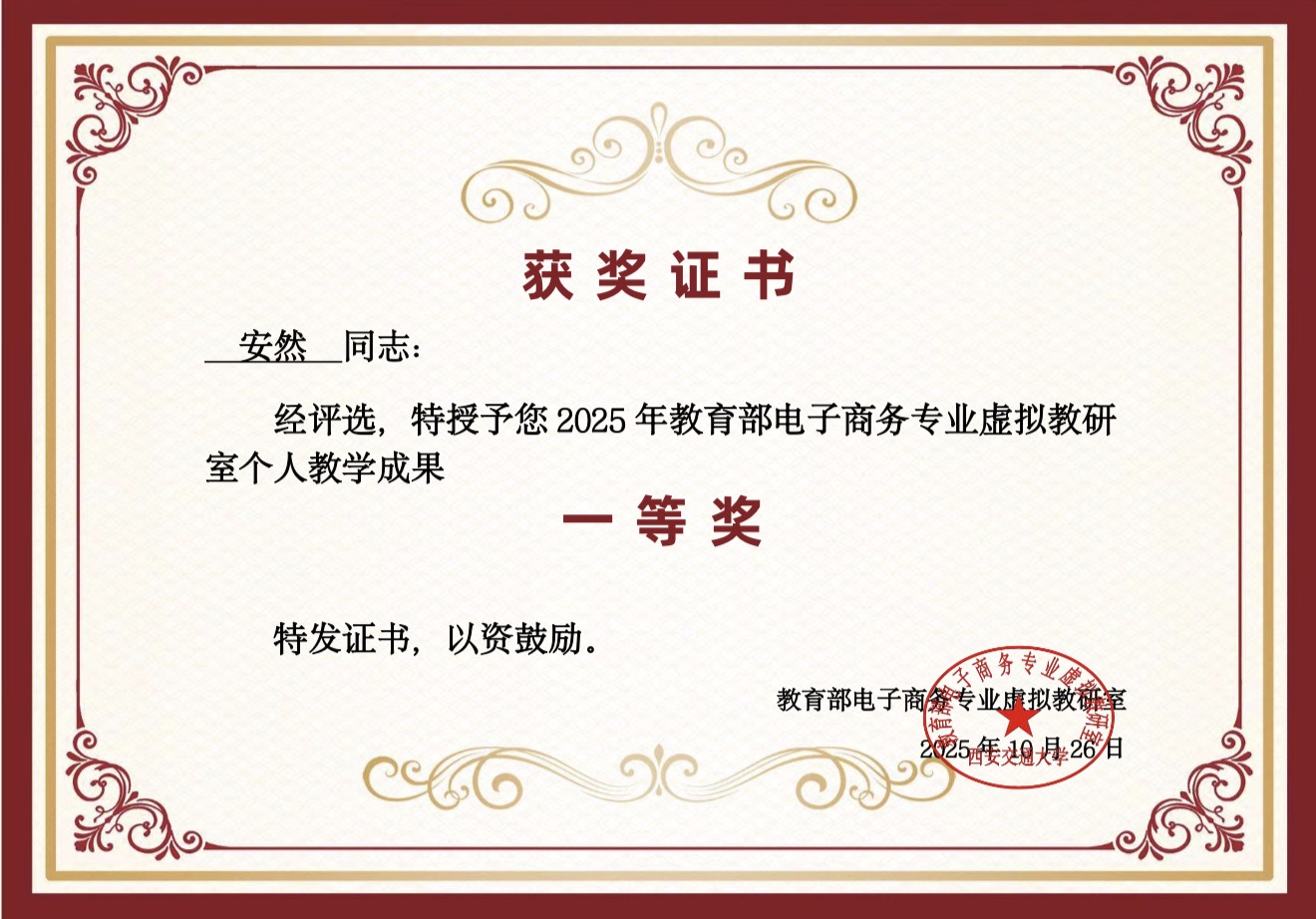 教育部电子商务虚拟教研室项目是推动高等教育高质量发展、构建新型基层教学组织的重要举措。本次教学成果奖评选汇聚了全国众多高校的优秀教学实践,竞争激烈。安然博士的获奖,充分展现了其扎实的教学功底和卓越的创新精神,也为学校赢得了广泛赞誉。