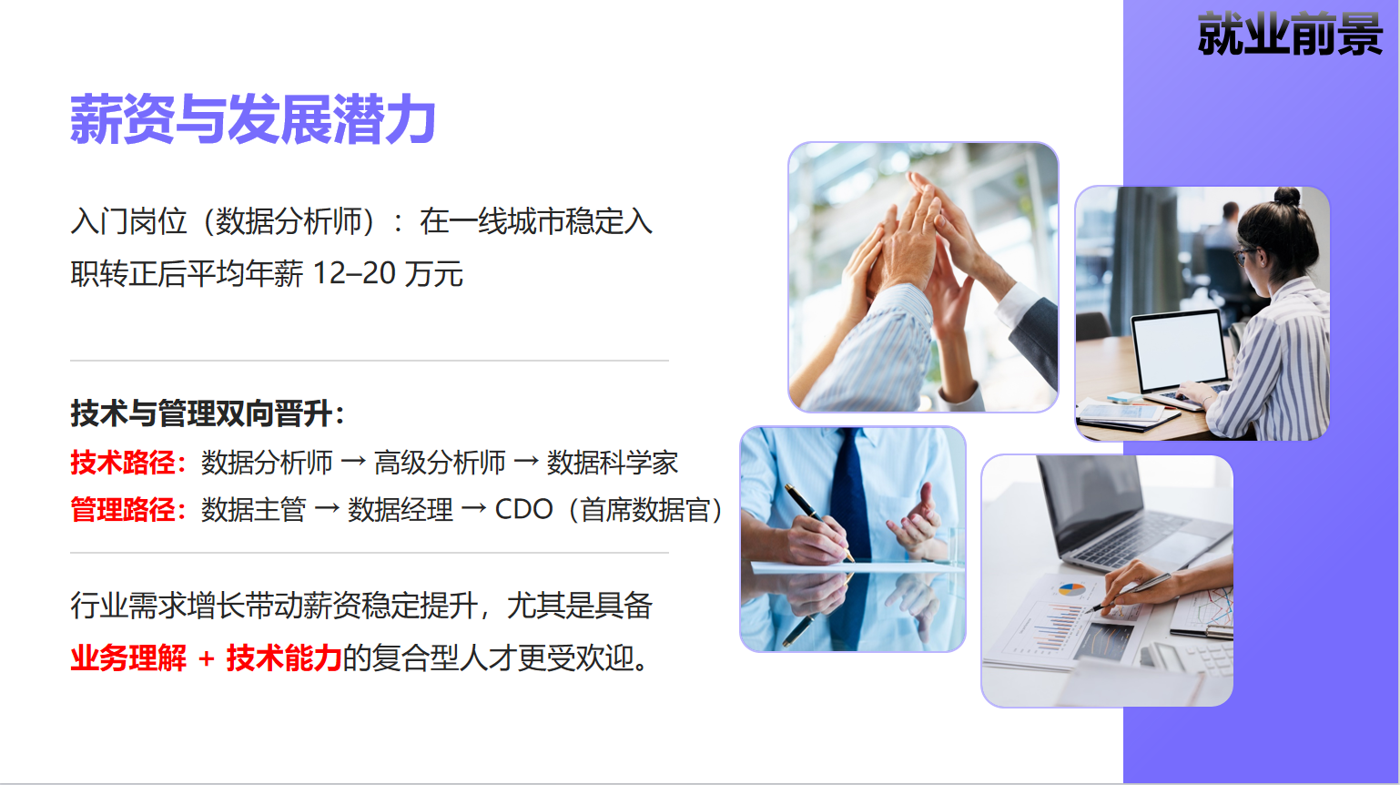 就业面向粤港澳大湾区数字经济核心领域,可在智能制造、电子商务、数字营销、金融科技、政府部门、企事业单位、数据服务机构从事数据治理、商业智能分析、数据产品运营、大数据开发、市场数据分析、数字化管理等岗位工作,就业口径宽、适配性强、职业发展空间广阔。