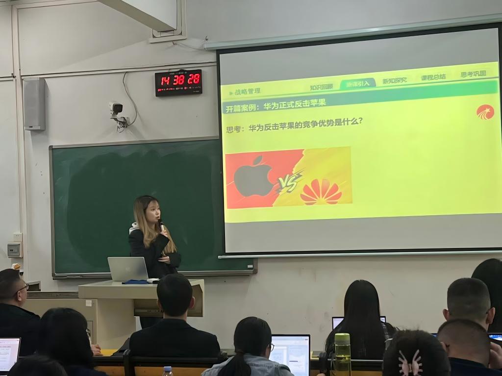 【本讯网】2025年10月24日下午3:00至5:00,工商管理教研室在教1-D204开展了本学期第5次公开课,本次公开课由谢泳琪老师主讲,授课内容为《战略管理》“竞争优势”这一章节,活动由单主任主持,工商管理教研室全体教师参与。公开课伊始,谢泳琪老师以“华为正式反击苹果”的开篇案例迅速抓住学生注意力,抛出“华为反击苹果的竞争优势是什么?”的思考问题。在新知探究环节,谢老师先明确“竞争优势”的概念,随后,她从“战略资...