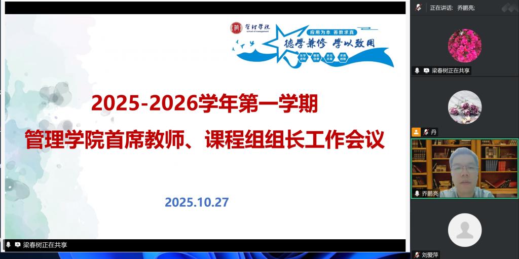 【本网讯】为充分发挥基层教学组织在人才培养中的核心作用,筑牢课程质量提升的根基,管理学院于10月27日晚上召开了2025-2026学年第一学期课程组长和首席教师工作线上会议,学院38名课程教研室主任和首席教师教师参加。会议由教学副院长梁春树副教授主持,学院院长乔鹏亮教授出席并发表了重要讲话。乔鹏亮院长在讲话中明确指出,基层教学组织是学院教学工作的核心执行单元,并就其关键作用提出三项要求:一是强化教学团队管理,...