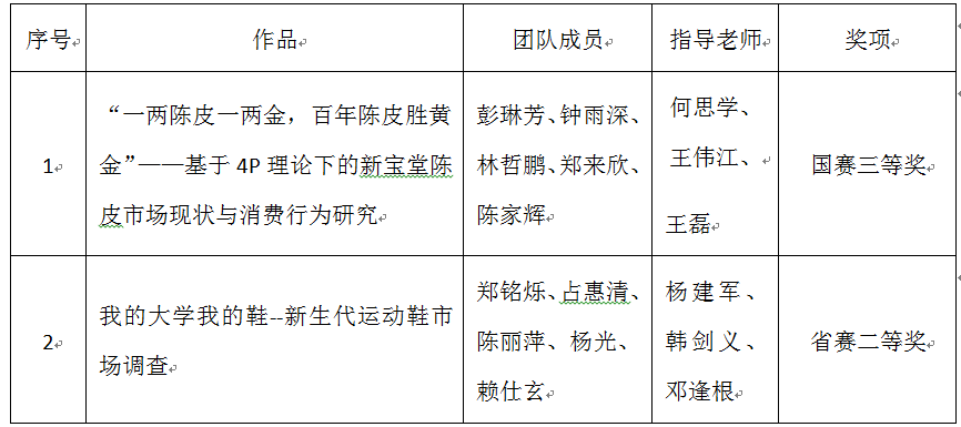 4月春风报喜迅。今年我院在第十一届全国大学生市场调研与分析大赛全国总决赛及广东省省赛中均获得优异成绩。第十一届全国大学生市场调查与分析大赛(CRA)广东省赛区选拔赛在暨南大学举行,来自全省各大高校268支队伍参赛竞逐名次。我院2支参赛队伍与众多211等高校队伍同台竞逐,最终两支队伍分别获得国家级三等奖、省级二等奖的好成绩。具体获奖名单如下:全国大学生市场调查与分析大赛是由中华人民共和国教育部主管,教育部高...