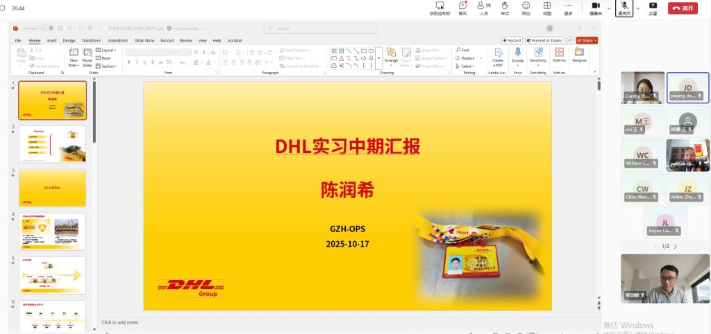 【本网讯】本学期物流管理专业2022级国际供应链运营实验班的9名学生在中外运-敦豪广东分公司开展集中实习。10月17日,中外运-敦豪广东分公司与管理学院联合开展了实习中期汇报活动。中外运-敦豪广东分公司运营总监张宇、人力资源部总监徐亚、培训中心经理蔡魏,以及学院副院长邹剑峰、物流管理专业教研室主任王文娟、实习指导老师刘嘉俪、陈曦、王姝娜出席汇报会,共同听取学子们的实习进展与感悟分享。这9名物流管理专业学子于...