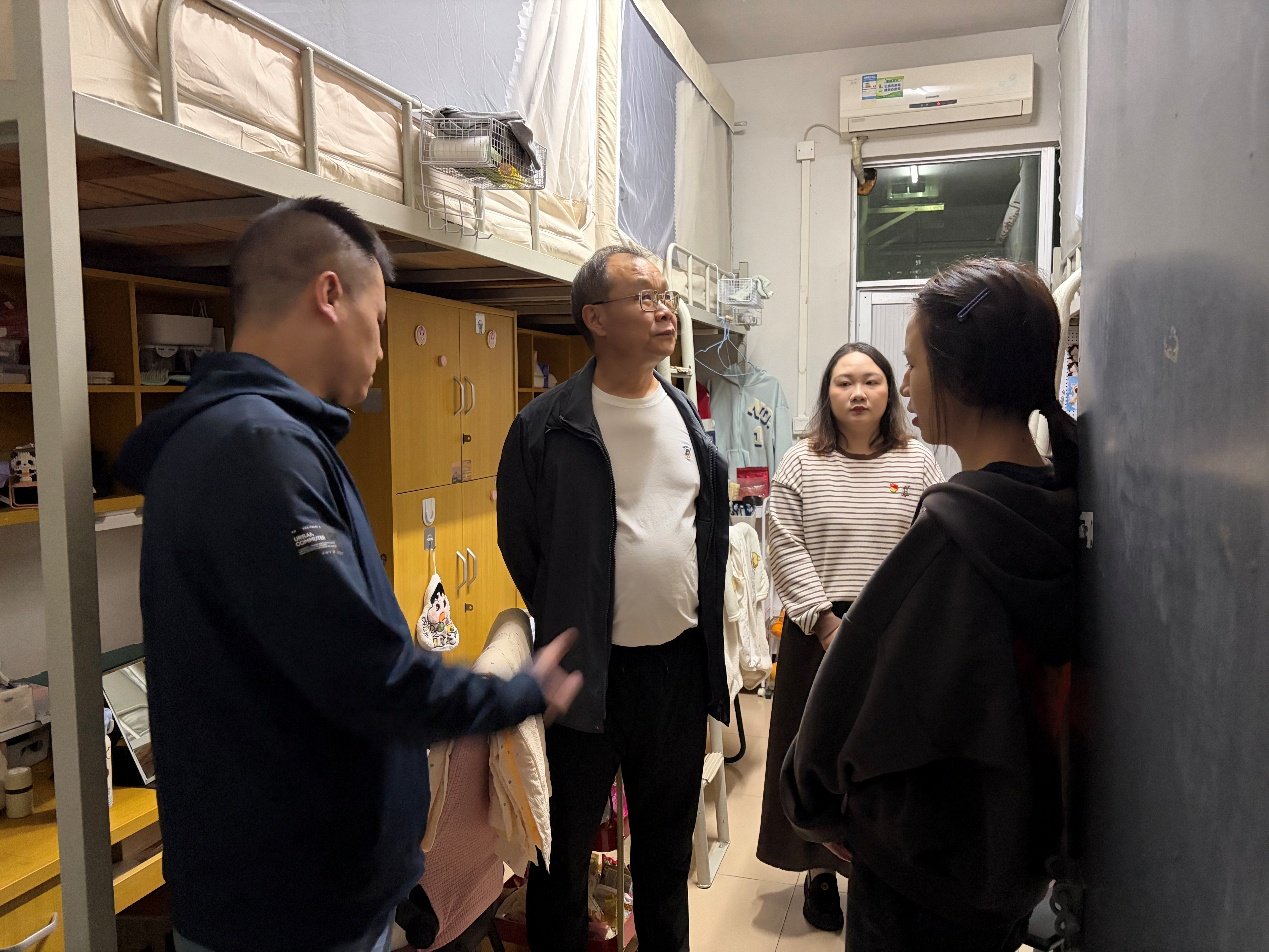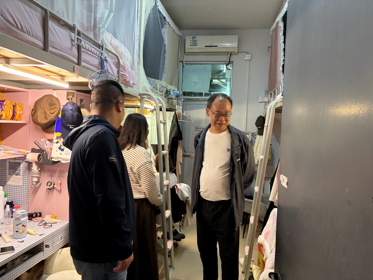 走访过程中,领导与老师们带着满满的关切走进每一间宿舍,与同学们围站在一起亲切交谈,细致察看宿舍卫生整洁情况、物品摆放秩序,对干净整洁的宿舍予以肯定,对存在卫生死角的宿舍耐心提醒同学们及时整改,引导大家养成良好生活习惯,共建文明舒适的住宿环境。同时,一行人重点排查宿舍用电、消防等各类安全隐患,逐一查看电器使用、线路排布、消防设施配备等情况,反复叮嘱大家时刻绷紧安全之弦,规范使用各类电器,坚决杜绝热得快、电暖器等违规大功率电器,远离明火隐患,牢记消防安全要点,熟练掌握火场逃生、灭火器使用等应急技能,保持宿舍日常通风干燥,切实做到防患于未然。