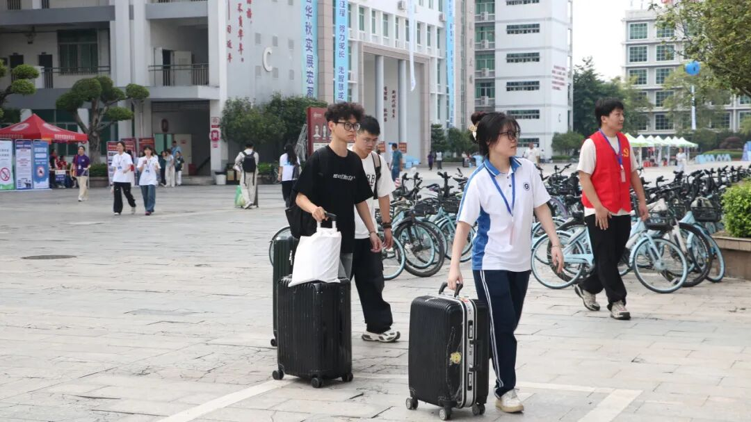 清晨七时,迎新站点工作人员及志愿者全员到岗。身着统一着装的志愿者分布在入口、报到处、宿舍楼、行李寄存点等区域,提供行李搬运、路线指引、信息咨询、秩序维护等全方位服务,助力新生顺利抵达宿舍。