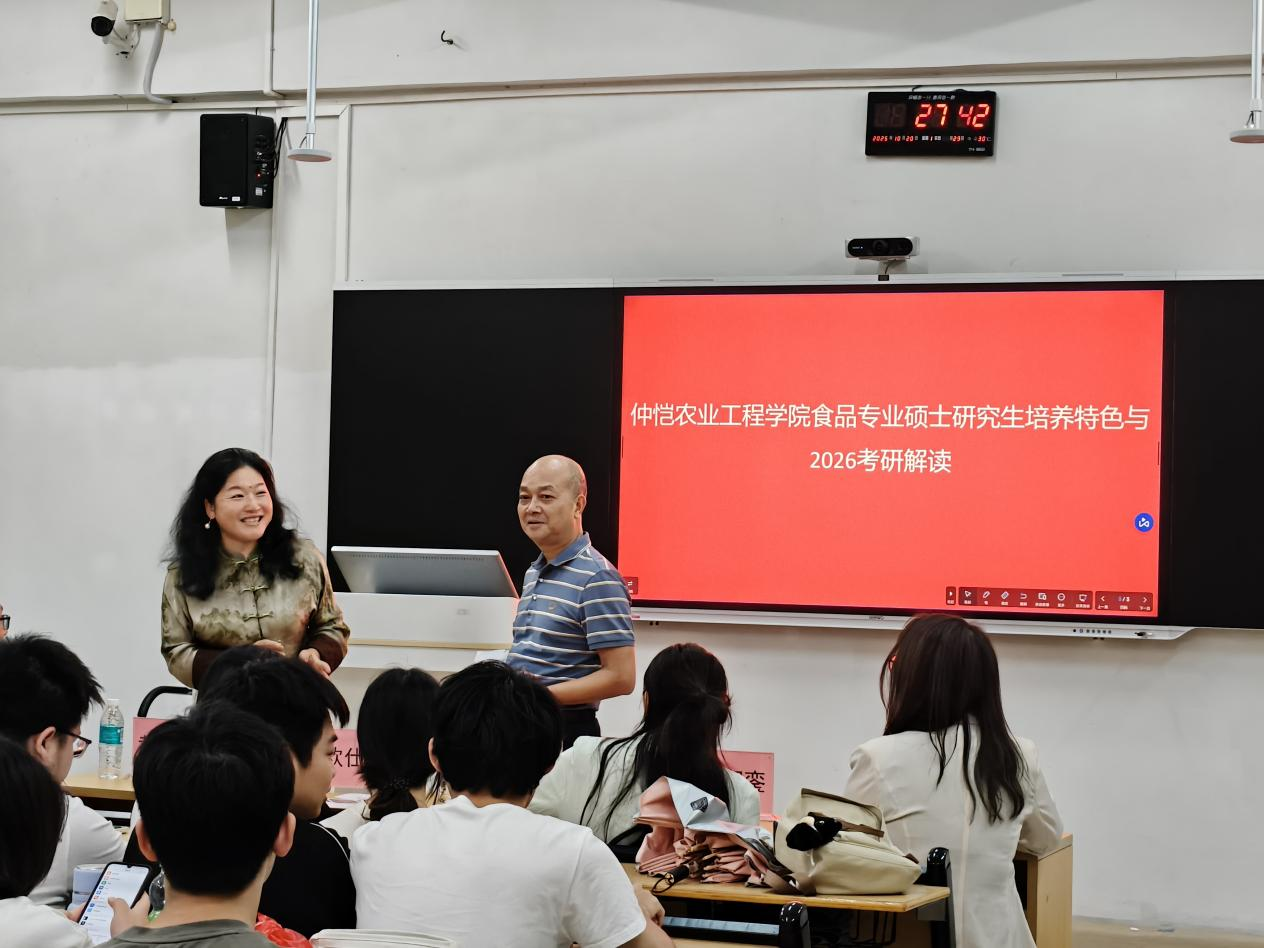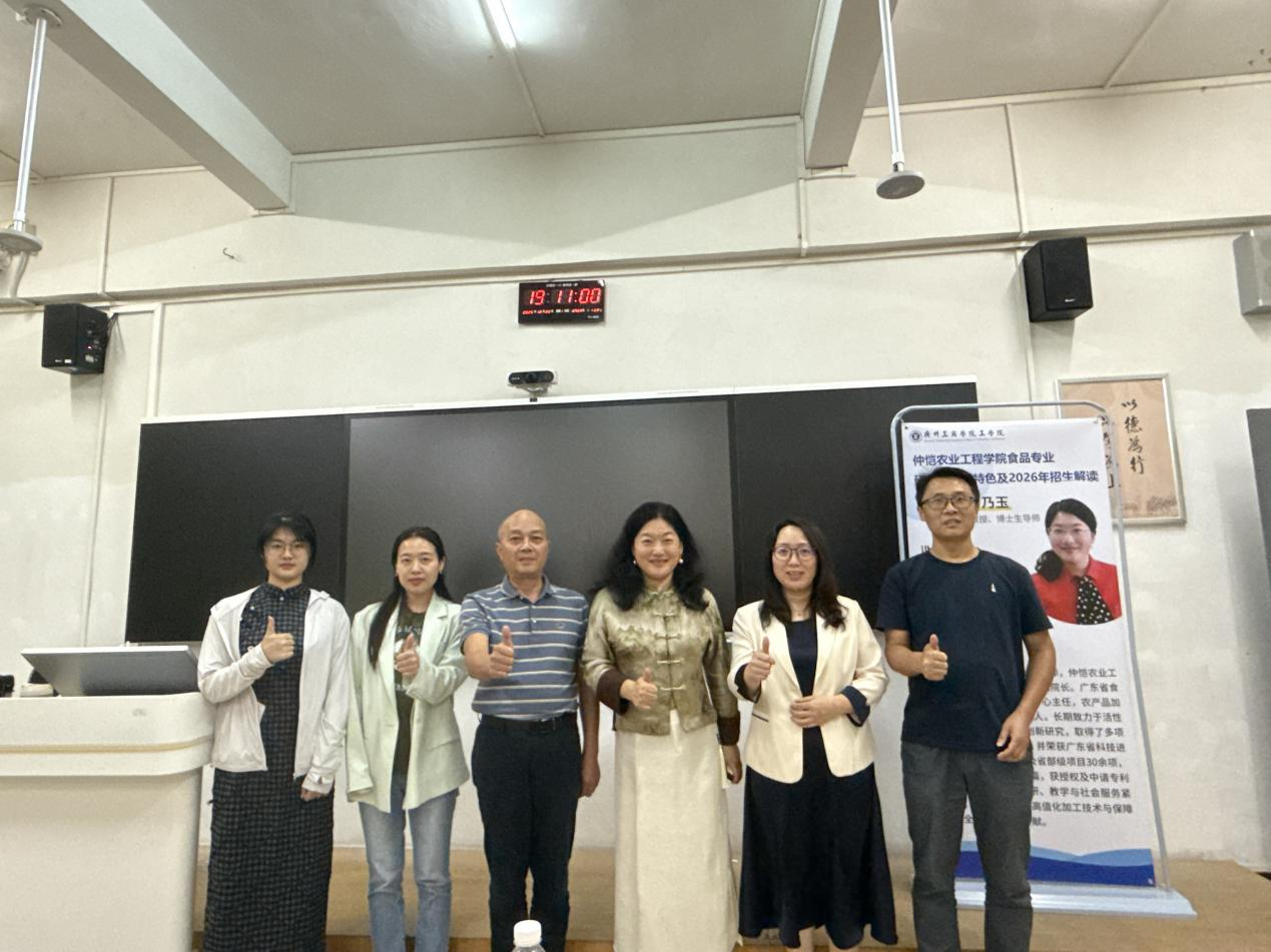 【本网讯】为帮助我校食品专业学子明晰考研方向、规划备考路径,深化我校与兄弟院校在学科建设及人才培养领域的交流合作,10月20日,我校特邀仲恺农业工程学院肖乃玉副院长(教授)、李湘銮老师莅临,开展食品专业硕士研究生培养特色与2026年考研解读专题讲座。工学院副院长欧仕益、食品质量与安全教研室杨春敏主任、黄训文老师及食品专业师生代表参加本次活动。