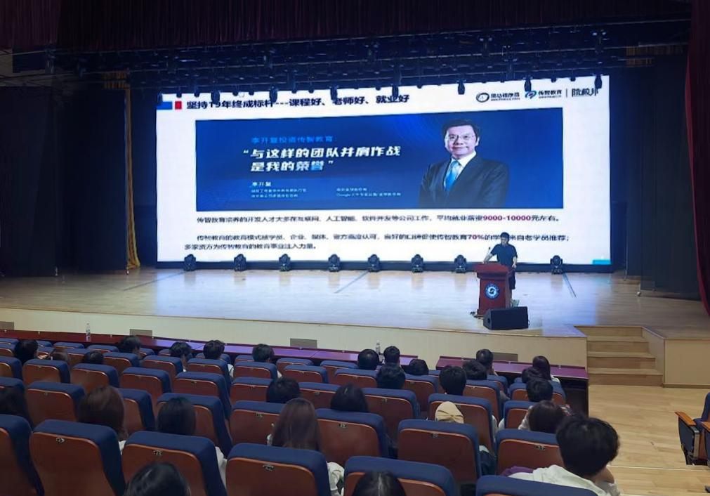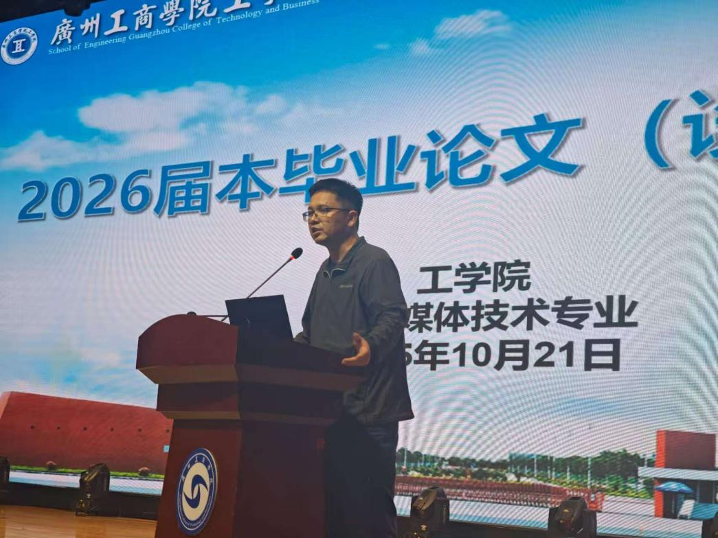 【本网讯】为扎实推进2026届数字媒体技术专业毕业论文(设计)与毕业实习工作,明确任务要求、规范流程管理,数字媒体技术专业于2025年10月21日在学校报告厅隆重召开“2026届毕业生毕设动员暨实习动员宣讲会”。数字媒体技术教研室主任兼专业负责人邵烨荣老师、教师代表刘怡伶、王兆龙老师,广州大画文化传播公司、黑马程序员企业代表和2026届数字媒体技术专业全体毕业生共同参会。