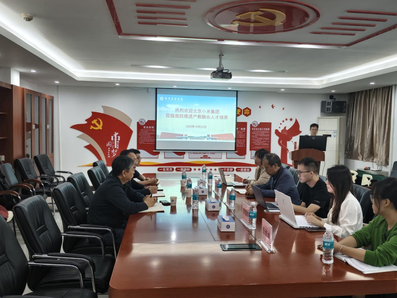 【本网讯】2025年10月22日,小米集团与广州工商学院工学院举行产教融合专题交流活动,推动校企合作走深走实,助力人工智能与智慧物联网(AIoT)领域人才培养。小米集团产教融合业务对外合作部区域总监张忠玉、小米产教融合共同体生态企业顾问许刚和任远,以及工学院副院长宋锋华、人工智能教研室主任刘红英、实验班负责人李慧婷、班主任甄雅迪、教师刘记伟等共同参与本次活动。