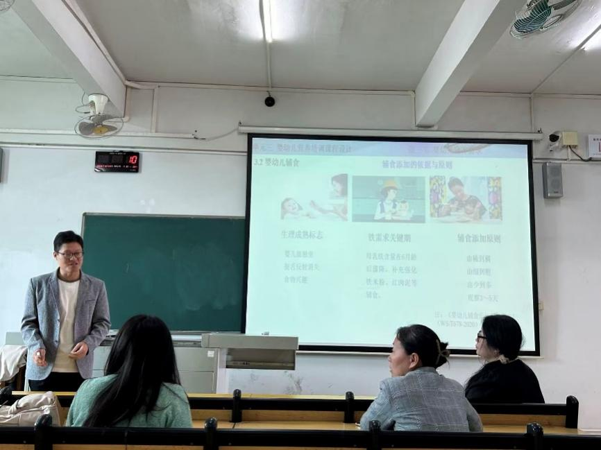 王钦庆老师围绕“婴幼儿营养培训课程设计”开展此次课堂教学,通过“婴幼儿辅食添加时间?”导入课堂,结合多次课堂互动实现了良好的教学效果。评委老师充分肯定了其课件婴幼儿营养内容的丰富性和专业性,建议课堂教学更多侧重讲授培训课程设计内容,引导学生进行资料查找、总结和输出。