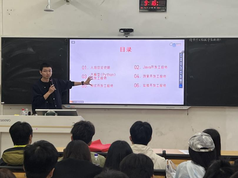 在Java 开发方向,何老师介绍了从 Java 面向对象编程、主流开发框架,到数据库技术、微服务架构,再到 Linux 运维的完整学习链路;针对当下热门的大模型开发领域,他分享了优秀学员斩获 30k 高薪 offer 的喜讯,同时讲解了 Python 开发、大数据处理、大模型原理与微调等核心技能要求,还展示了资产驾驶舱、智慧城市等大模型项目成品;对于前端、鸿蒙、测试、运维等方向,何老师也分别梳理了各岗位的职责范畴、核心技术栈与学习路线,并结合实际工作环境与项目案例,让同学们对不同岗位的工作模式有了直观认知。