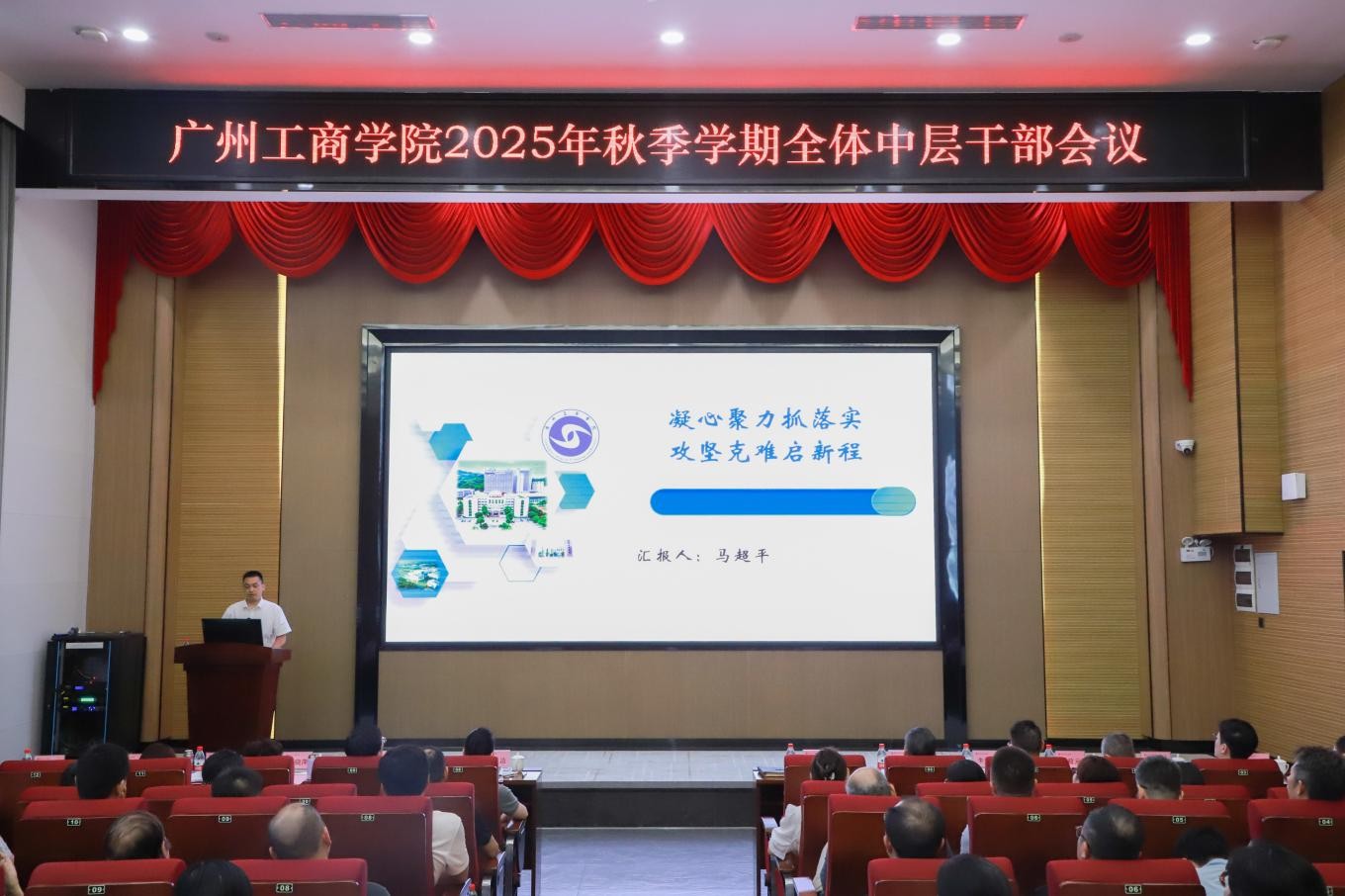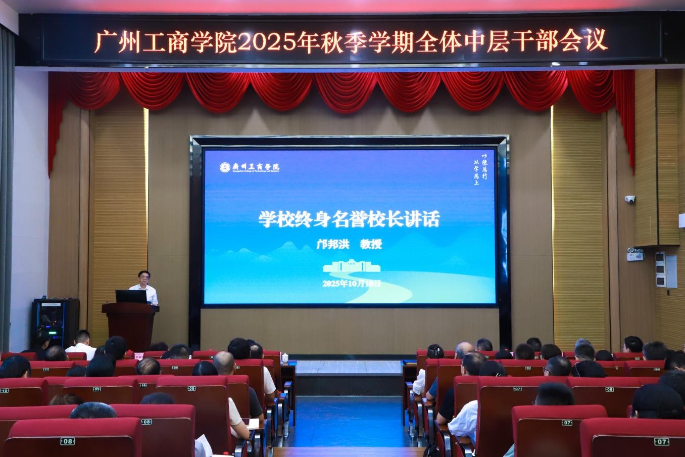 终身名誉校长邝邦洪教授讲话。他深情回顾了学校从小到大,从弱到强的发展历程,并结合自身对学校的深厚情感与观察思考,向全体中层干部提出三点殷切期望:一是传递发展信心,凝聚奋进共识。作为关键桥梁,要准确传达学校发展成就与未来蓝图,坚定教职工信心,形成奋斗合力。二是强化责任担当,提升执行效能。围绕申硕等核心目标,不折不扣完成任务,主动作为、狠抓落实,破解工作难题。三是永葆乐观心态,共建幸福校园。以积极心态应对压力,兼顾工作与健康,带头传递正能量。