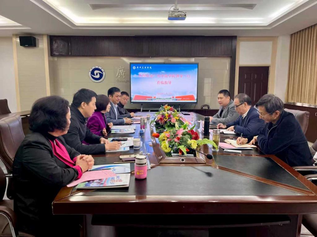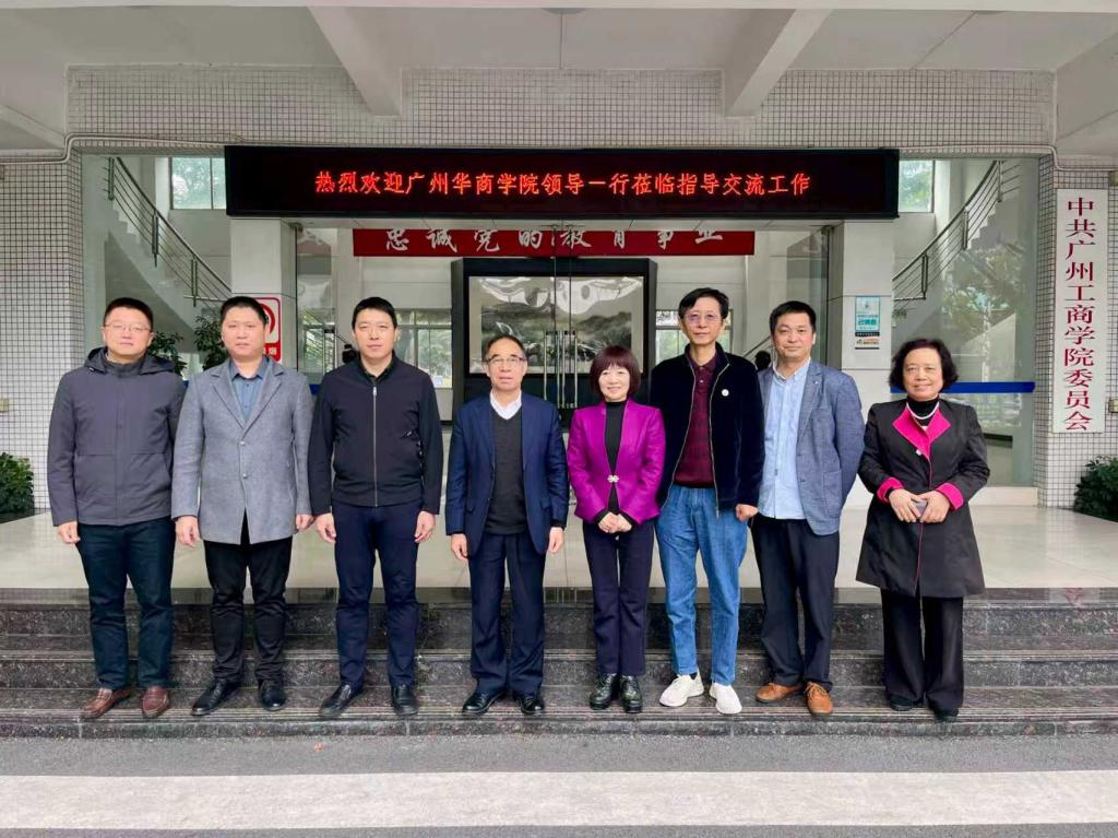 【本网讯】为深化校际合作,共探新商科建设与高质量发展路径。11月20日上午,广州华商学院原执行校长、现任顾问郭银华教授一行莅临广州工商学院花都校区考察交流。广州工商学院副校长易露霞、校长助理易亚军、马超平,商学院院长林波,教务处副处长安宁等领导参加座谈交流。会议由易露霞副校长主持。