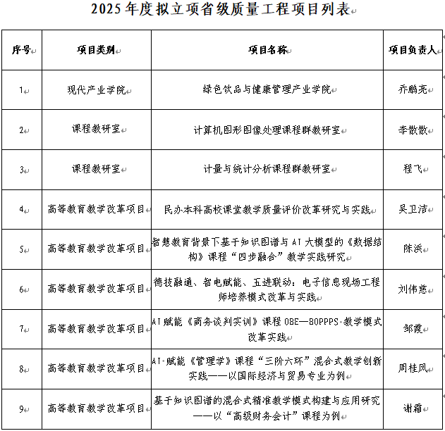 【本网讯】近日,广东省教育厅发布《关于2025年度广东省本科高校教学质量与教学改革工程拟立项项目的公示》,学校申报9项,入选9项,立项率100%。拟立项项目包括省级现代产业学院1项(管理学院),省级课程教研室2项(工学院、商学院),省级高等教育教学改革项目6项(学校办公室1项、工学院2项、管理学院1项、商学院1项、会计学院1项),充分彰显了学校在教育教学改革方面的扎实成效。