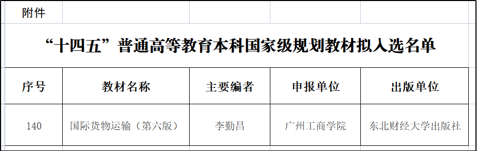 【本网讯】近日,教育部发布《关于“十四五”普通高等教育本科国家级规划教材拟入选名单的公示》,我校商学院李勤昌教授主编的《国际货物运输(第六版)》成功入选,这是我校在教材建设领域取得的重大历史性突破。同时,我校也是广东省唯一入选该名单的民办高校。