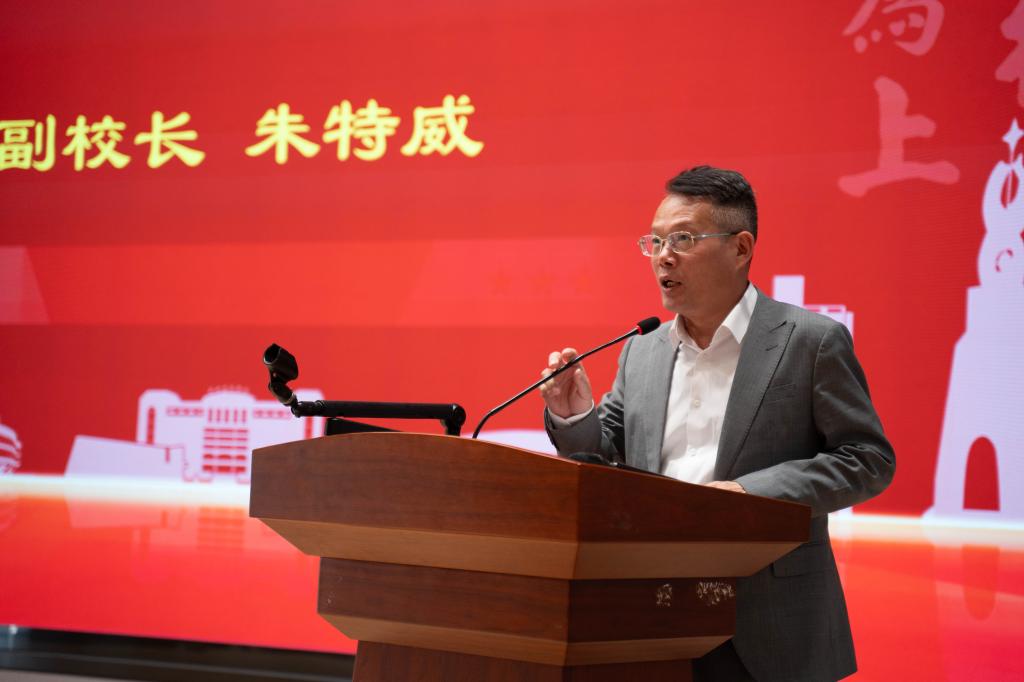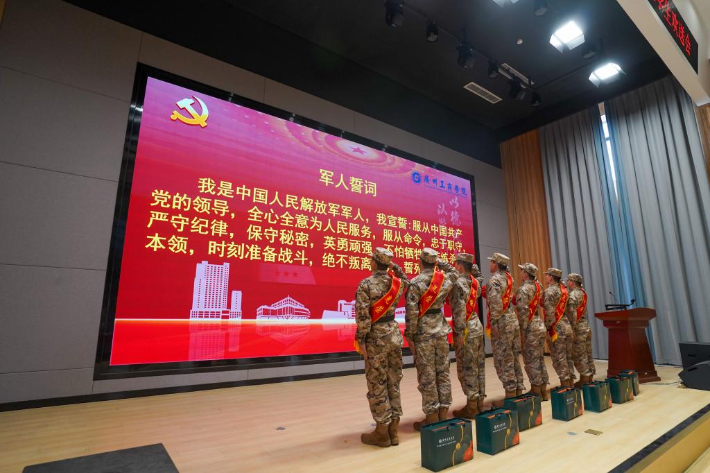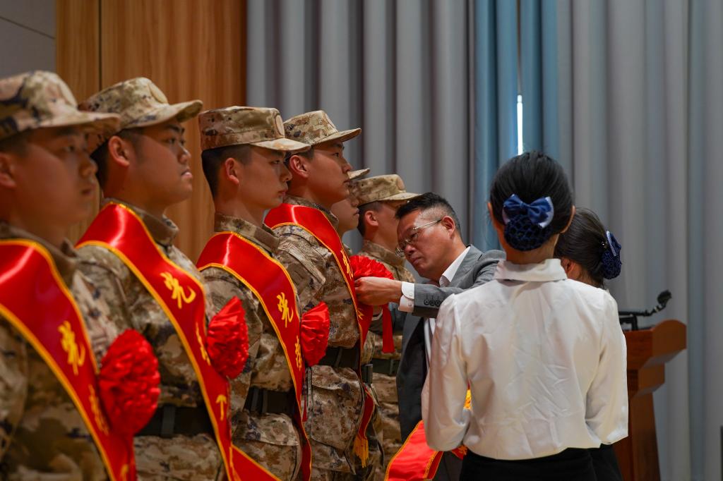 朱特威副校长为7名入伍新兵佩戴“光荣入伍”大红花并赠送纪念品。全体新兵庄严宣誓,以铿锵誓言彰显矢志军营、报效祖国的坚定信念。
