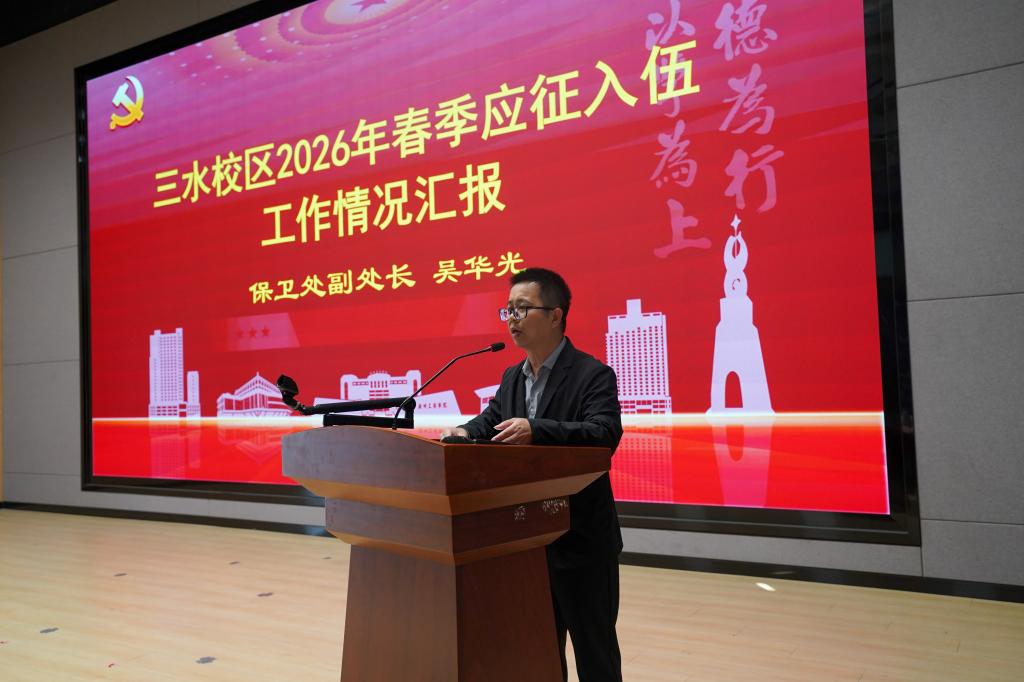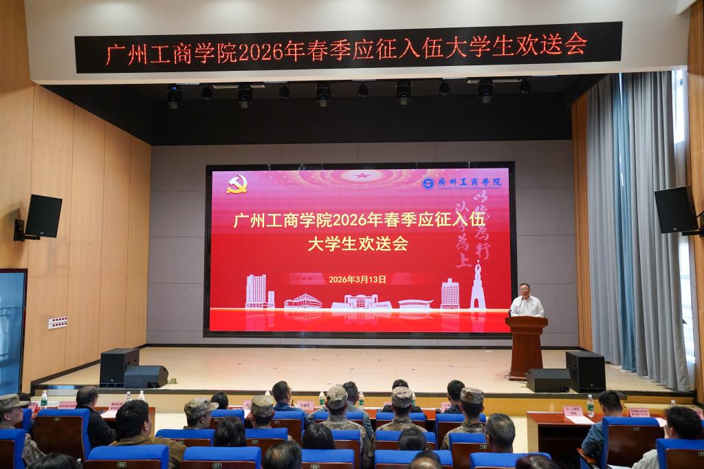 【本网讯】春风送暖,壮志飞扬;身披戎装,奔赴荣光。3月13日下午,学校在三水校区举行2026年春季应征入伍大学生欢送会。学校党委副书记、纪委书记、副校长朱特威出席,保卫处副处长、三水校区管委会副主任吴华光,学生处副处长苏建贤,学校武装部、三水校区各二级学院分管征兵工作副院长及学工办主任,入伍学生与家长代表、240余名在校学生代表参加活动,会议由保卫处副处长孙洪波主持。