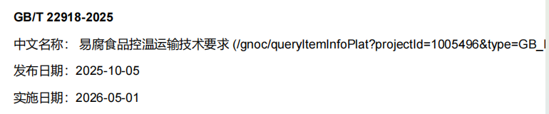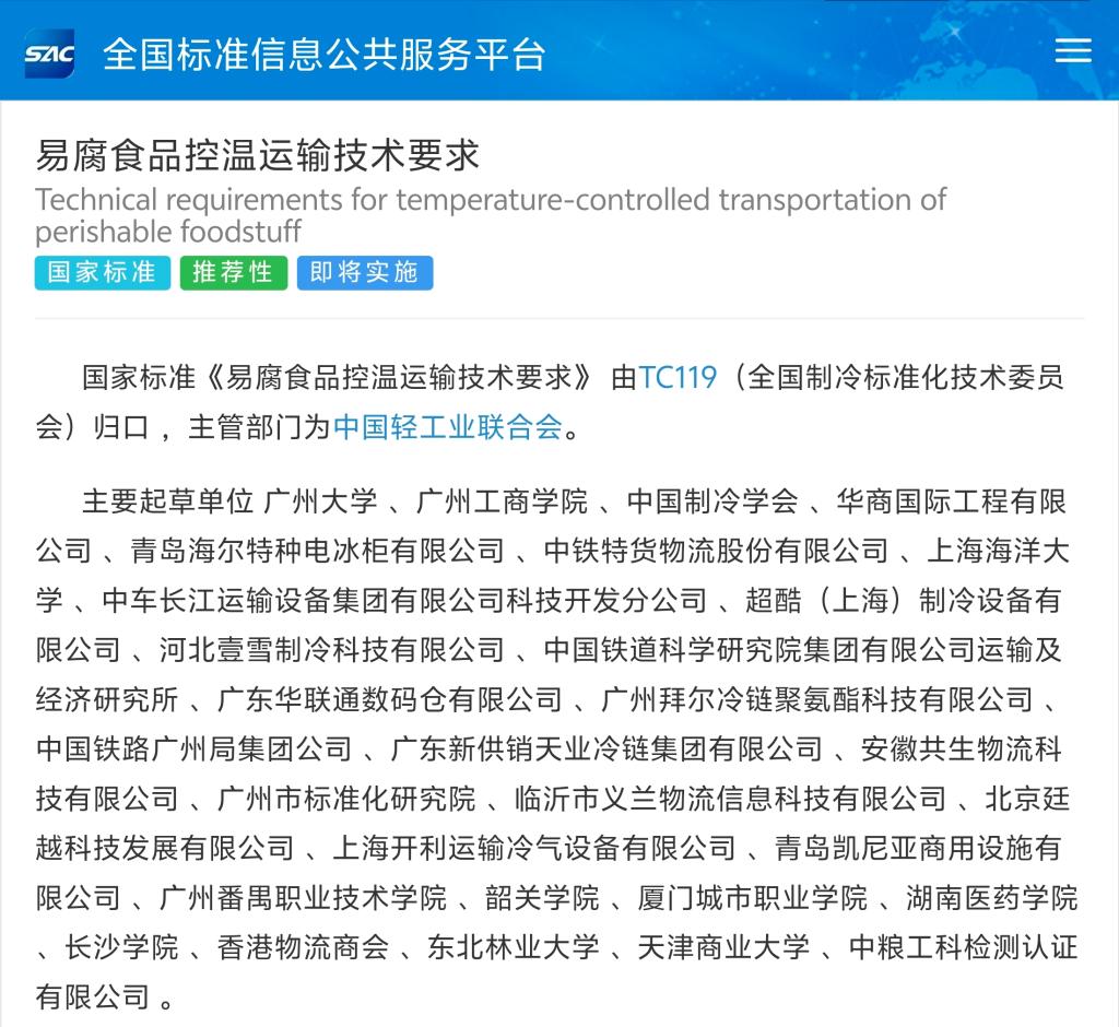 【本网讯】近日,国家标准化管理委员会发布公告,由广州大学作为第一、广州工商学院作为第二编制单位的国家标准《易腐食品控温运输技术要求》(GB/T 22918-2025)修订版正式发布,将于2026年5月1日起实施。