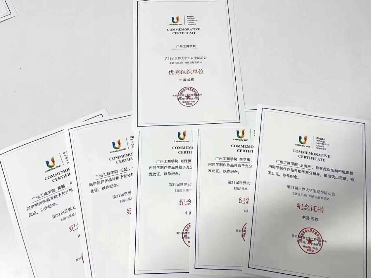 据介绍,在大赛之前,广州工商学院就已经积极参加有关作品的报送工作。由广州工商学院黄鹏、刘嘉丽、王凌丹、王超、李青、李学禹等多位老师和校友策划和组织,全校遴选部分学生联合演绎的成都世界大运会主题推广歌曲之一——《有一个想去成都的理由》音乐MV温暖上线。师生们以青春的姿态,用动人的音符唱响美丽乐章,制作广工商版大运会MV,向世界青年发出盛会邀约。视频拍摄得到团中央全国学校共青团研究中心和第31届世界大学生夏季运动会歌曲推广专业委员会的指导。作品报送后,广州工商学院荣获第31届世界大学生夏季运动会主题音乐推广暨作品征集活动“优秀组织单位”,5位老师获“突出贡献奖”,美术学院、外语学院、商学院等16位学生获得优秀作品证书。