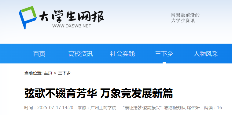 大学生网报7月17日讯(通讯员 房怡妍)为贯彻落实大学生志愿者暑期文化科技卫生“三下乡”社会实践活动及广东青年大学生“百千万工程”突击队行动部署,2025年7月6日,“素坯绘梦·瓷韵振兴”志愿服务队走进梅州市高陂中学,在校园与学生的故事里探寻陶瓷文化的印记。