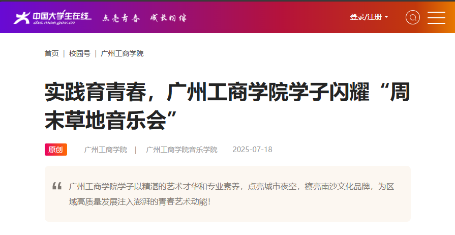 当灵山岛畔的晚风轻拂过草地,青春的旋律便在广州市南沙明珠湾的夜空下激情回荡。 近日,由南沙区新时代文明实践中心、区委宣传部、明珠湾管理局、横沥镇、南沙越秀国际金融中心联合主办,多家单位协办的明珠湾露营季暨南沙高校专场草地“周末音乐会” 圆满落幕。广州工商学院学子们作为核心演出力量之一,携手星海音乐学院、广东外语外贸大学艺术学院等高校同台献艺,以精湛的艺术才华和专业素养,点亮城市夜空,擦亮南沙文化品牌,为区域高质量发展注入澎湃的青春艺术动能!