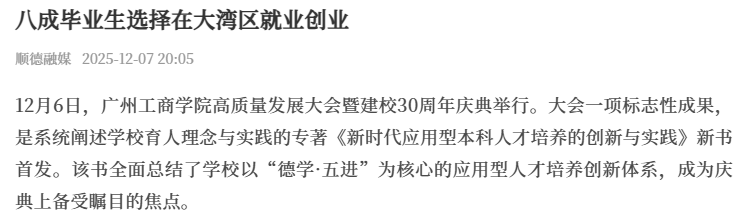 该书的发布,是对学校长期以来深化产教融合实践的理论升华。广州工商学院紧密对接粤港澳大湾区发展战略,与众多知名企业共建产业学院和协同育人平台,将真实生产项目、行业技术标准和企业导师资源全方位引入人才培养过程。书中通过大量生动案例,揭示了学生如何在“实验实训室”和“社会”大课堂中锤炼真本领。这种“学用结合、知行合一”的培养路径,确保了毕业生不仅掌握扎实的专业知识,更具备良好的职业素养和快速的岗位适应能力,使得学校累计培养的十万余名毕业生中,超过80%选择在粤港澳大湾区就业创业,成为服务区域经济社会发展的重要力量。其中,大批毕业生在顺德制造业就业以及在顺德创业。