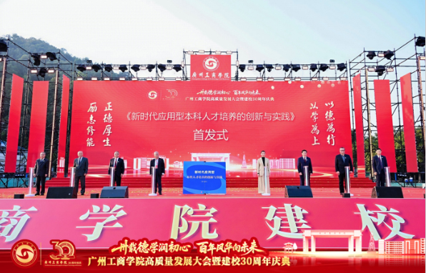 庆典上,《新时代应用型本科人才培养的创新与实践》新书首发,系统总结了学校“德学·五进”育人模式的实践经验。副校长汪前元宣读了“广州工商学院杰出校友”表彰决定,终身名誉校长邝邦洪为杰出校友颁奖,表彰了为社会发展作出突出贡献的优秀校友。