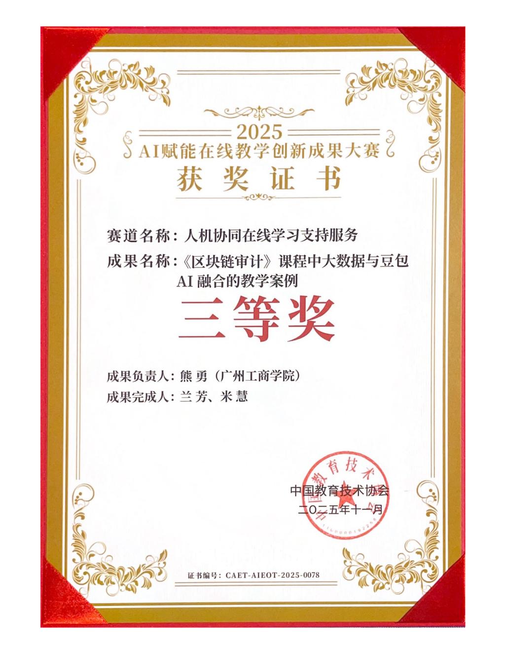 【本网讯】近日,由中国教育技术协会主办的2025年度AI赋能在线教学创新成果大赛评选结果正式揭晓。广州工商学院会计学院由熊勇博士、兰芳博士、米慧博士组成的教学团队,以《区块链审计》课程中融合大数据与豆包AI的创新教学案例,在“人机协同在线学习支持服务”赛道的激烈角逐中脱颖而出,荣获全国三等奖,为会计学院智慧教学改革增添成果。