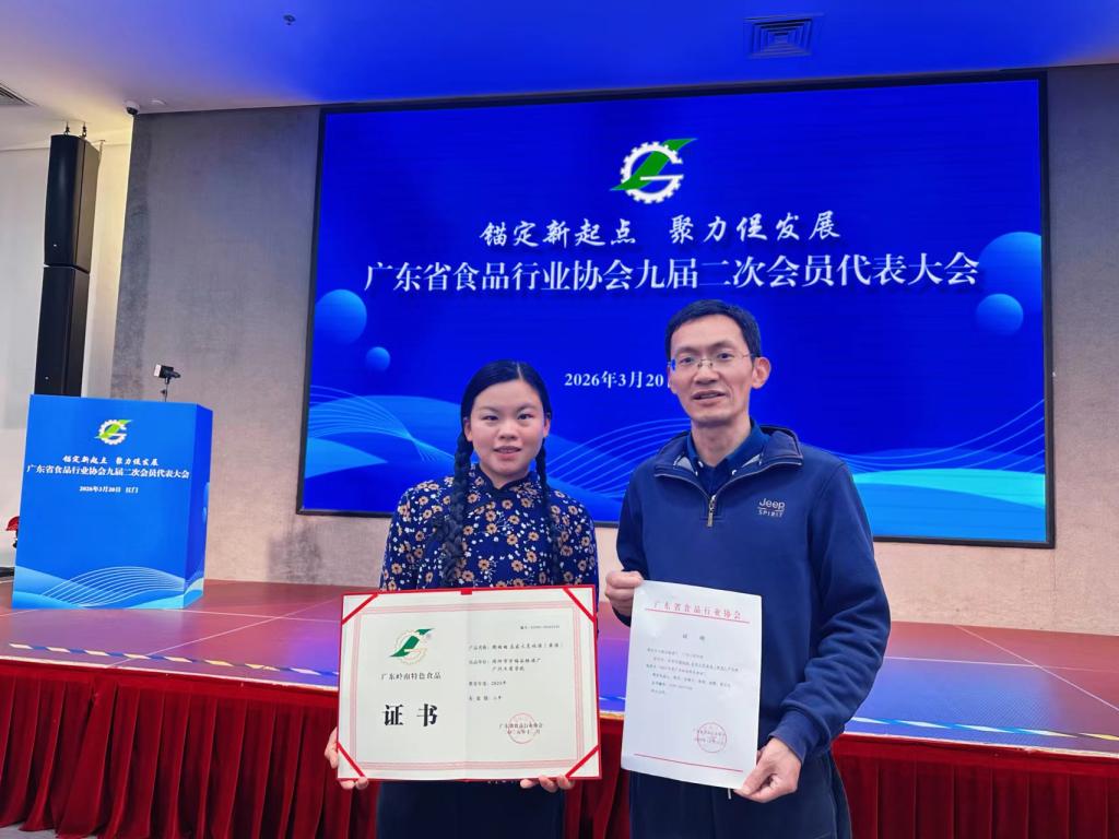 【本网讯】3月20日,广东省食品行业协会九届二次会员代表大会在江门召开,会上正式发布2025年度广东省食品行业 “三品”(增品种、提品质、创品牌)专项行动项目评价结果并颁发了证书。由创新创业教育学院佛山市陈伟创业指导师工作室、大健康与管理学院副教授陈伟主持研发的校企产学研创合作产品“穗姑姑客家火炙娘酒(黄酒)”,历经材料审核、样品检测、专家评审等多轮严格遴选,凭借深厚的文化底蕴、独特的工艺特色、卓越的产品品质及市场成效,成功斩获“广东岭南特色食品” 称号,成为学校深化产教融合、创新创业服务与赋能地方特色产业发展的又一标志性成果。